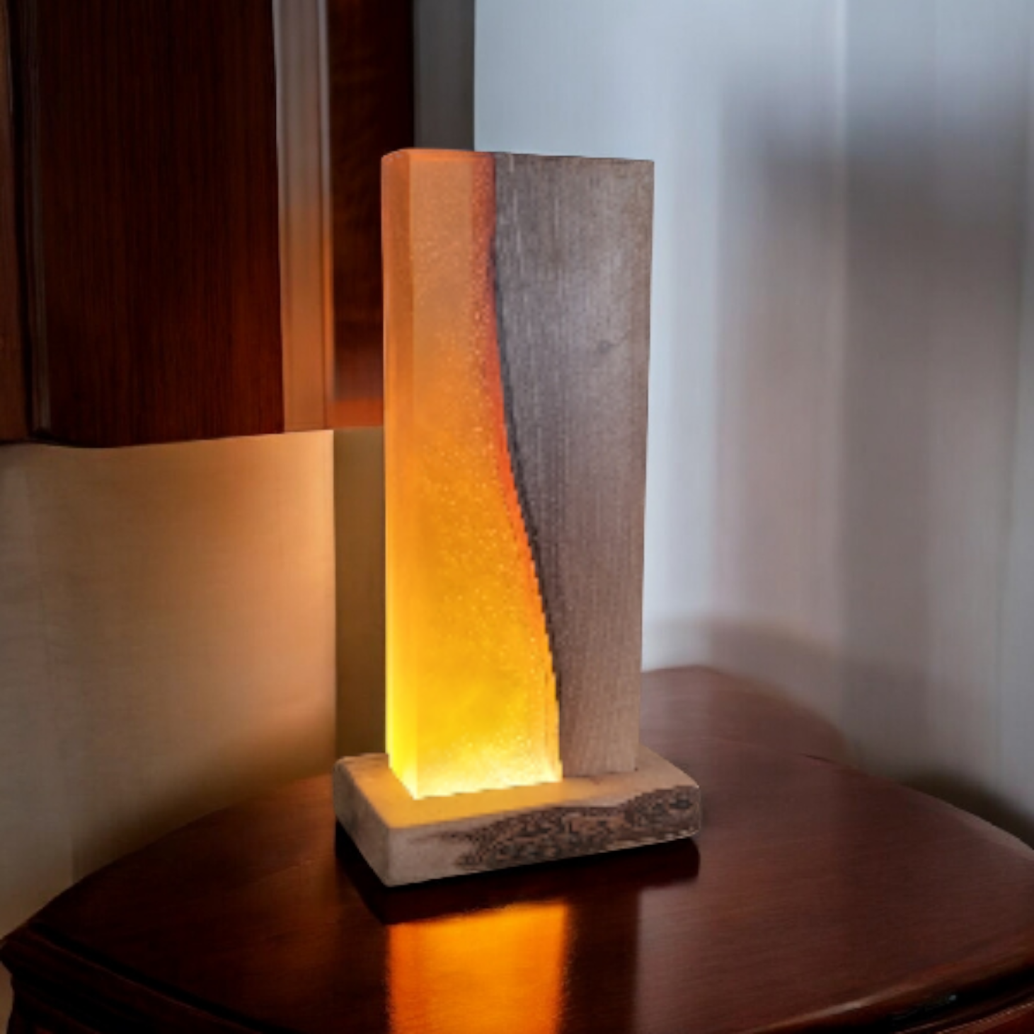 Lampe d’Ambiance N°79 – Élégance Intemporelle en Noyer et Résine Ambrée Un éclat chaud et naturel pour sublimer votre intérieur