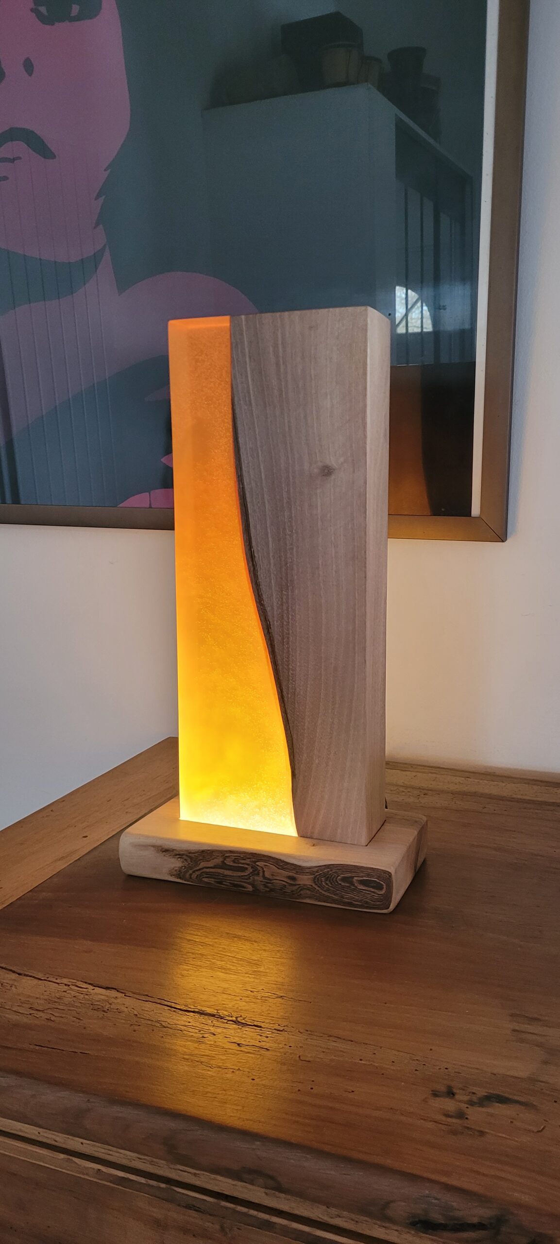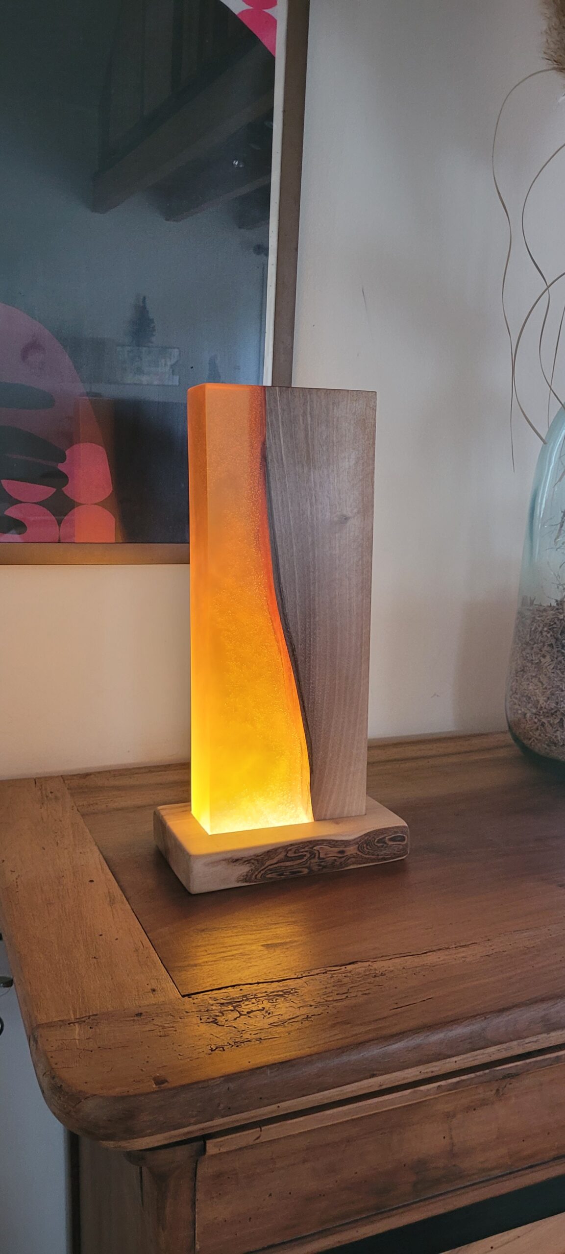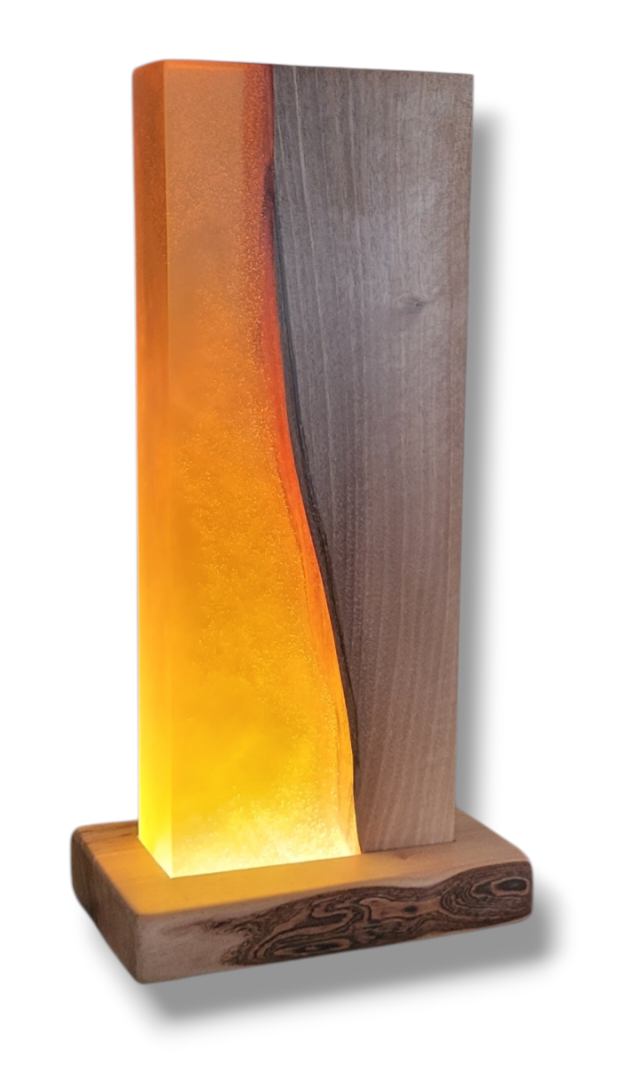 Découvrez la Lampe d’Ambiance N°79, une pièce d’exception où le bois de noyer se marie avec la résine époxy ambrée, pour un rendu à la fois chaleureux et sophistiqué. Chaque lampe est fabriquée à la main, ce qui en fait un objet unique, parfait pour les amateurs de design et de décoration authentique.