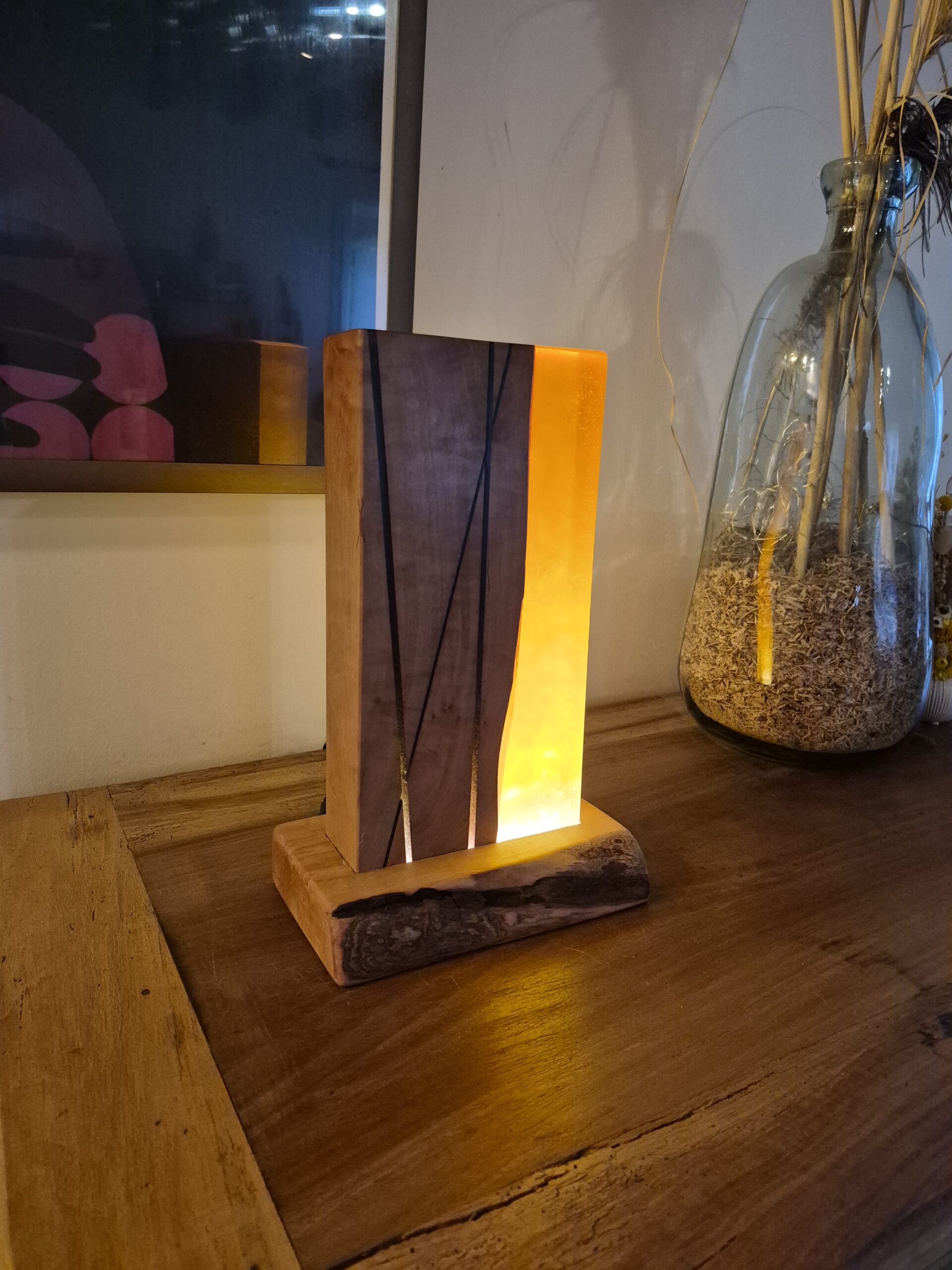 Apportez une ambiance chaleureuse et lumineuse à votre intérieur avec cette lampe artisanale unique, réalisée à partir de bois de poirier et de résine époxy orange aux reflets vibrants. Chaque pièce met en valeur les veinages naturels du bois, sublimés par la transparence colorée de la résine.