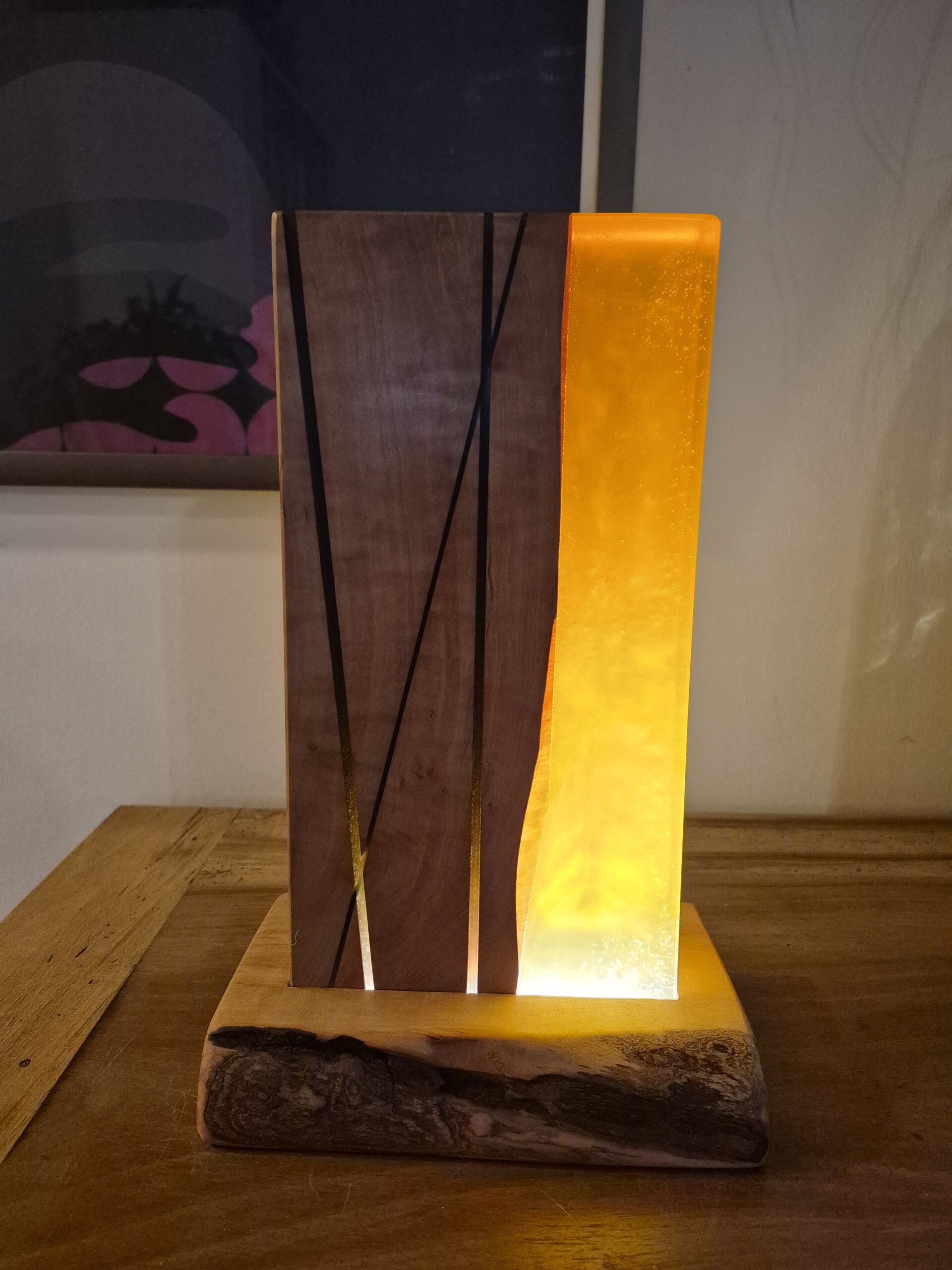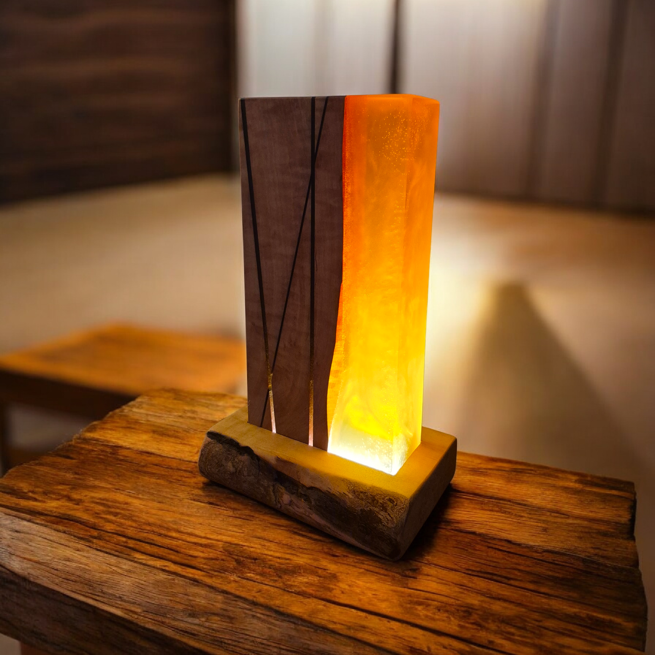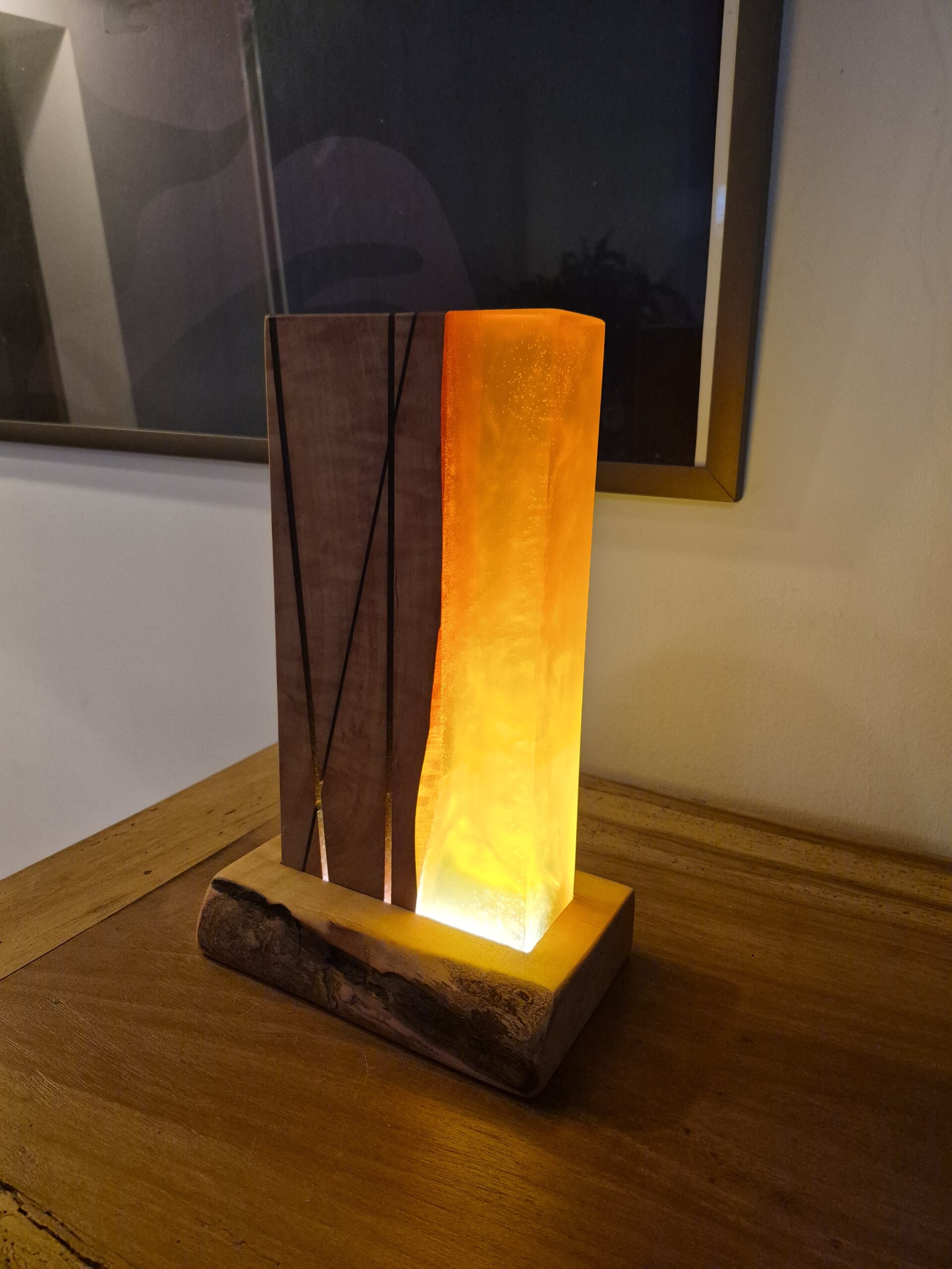 Lampe artisanale en poirier et résine époxy orange – LED tactile à intensité variable